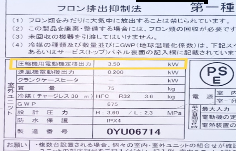 室外機に貼ってある銘板の圧縮機用電動機定格出力を確認してください。